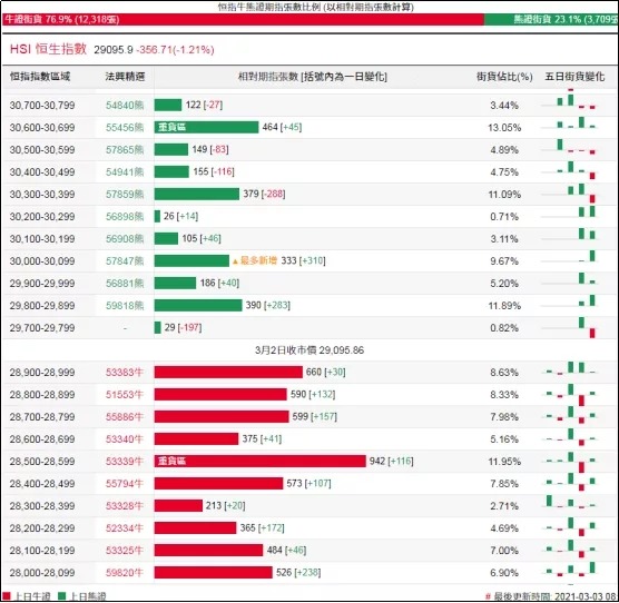 街货分布方面,至周二,恒指牛证街货重货区仍在收回价28500点至29000点之间,累计相当约3166张期指合约;恒指熊证街货重货区仍在收回价30300点至30800点之间,累计相当约1269张期指合约。