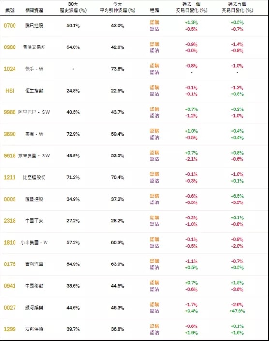 周二恒指相关权证的平均引伸波幅约22.5%,按日基本持平。个股方面,腾讯、阿里、京东、中移相关认购证的引申波幅按日有所调升;相反,吉利与银河相关认购证的引申波幅则调降明显。