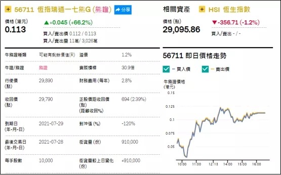 1、强势轮证:恒指瑞通一七熊(56711.HK),周二上涨66.2%;