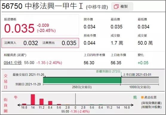 2、看错方向:中移法兴一甲牛(56750.HK),周二下跌20.45%。