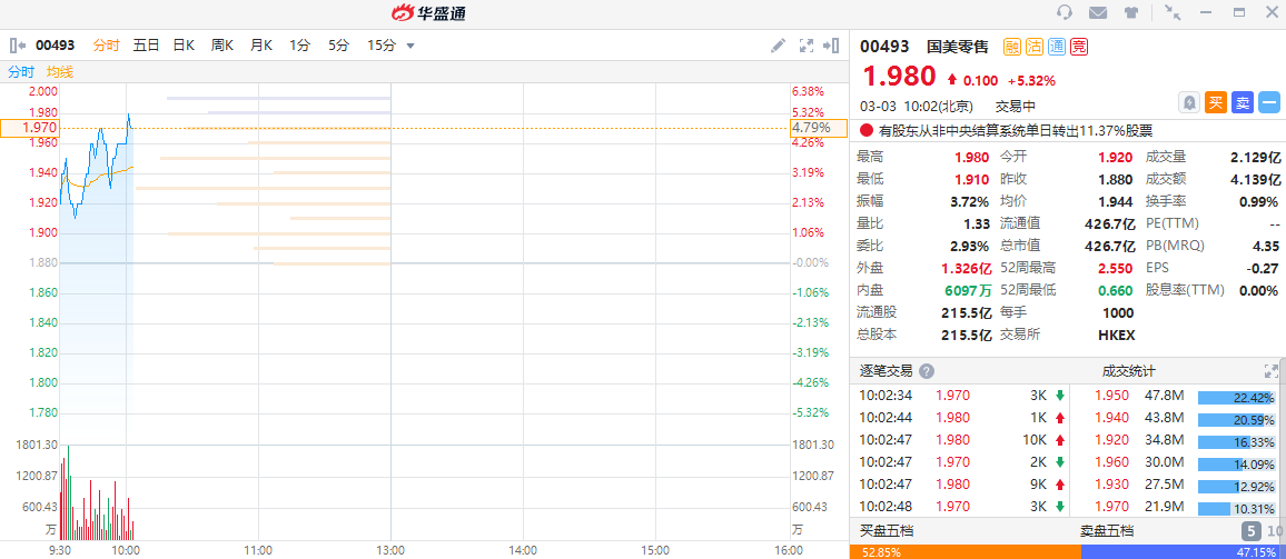 华盛资讯3月3日消息,国美零售连跌两日后今反弹回升,盘中一度涨逾5%。截至发稿,国美零售涨5.32%,现报1.98港元每股,暂成交4.139亿,当前总市值为426.7亿港元。
