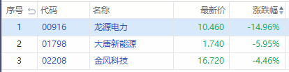 华盛资讯3月3日消息,港股风电股走低,龙源电力跌近15%,大唐新能源跌近6%,金风科技跌超4%。