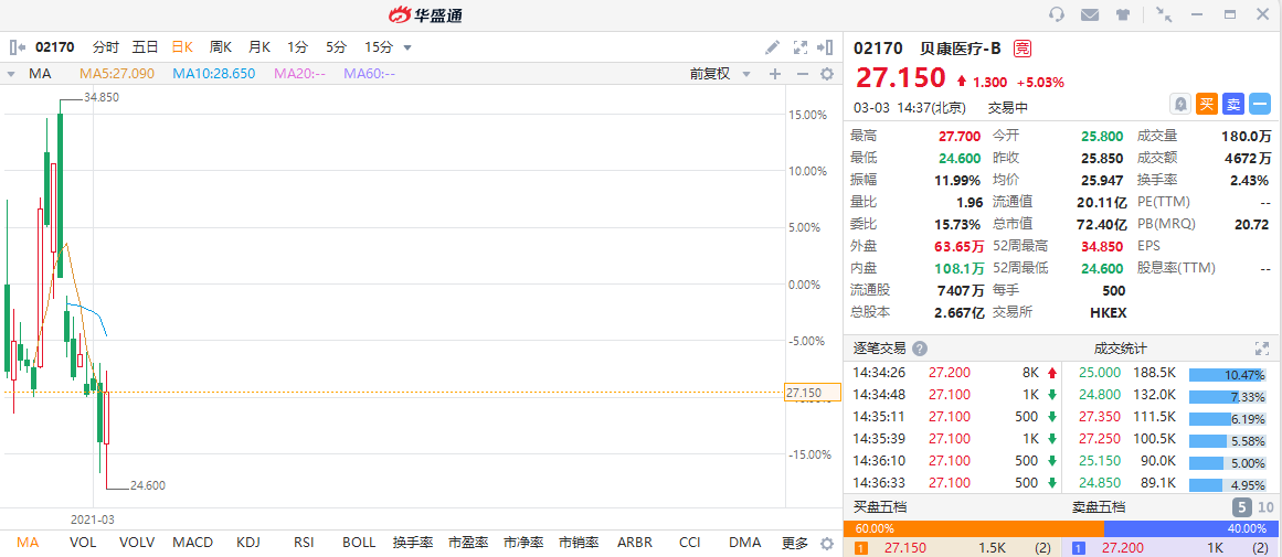 华盛资讯3月3日消息,贝康医疗午后转涨,股价一路上扬超7%,早盘曾跌至24.6港元创上市新低。截至发稿,贝康医疗涨5.03%,现报27.15港元每股,暂成交4672万,当前总市值为72.4亿港元。