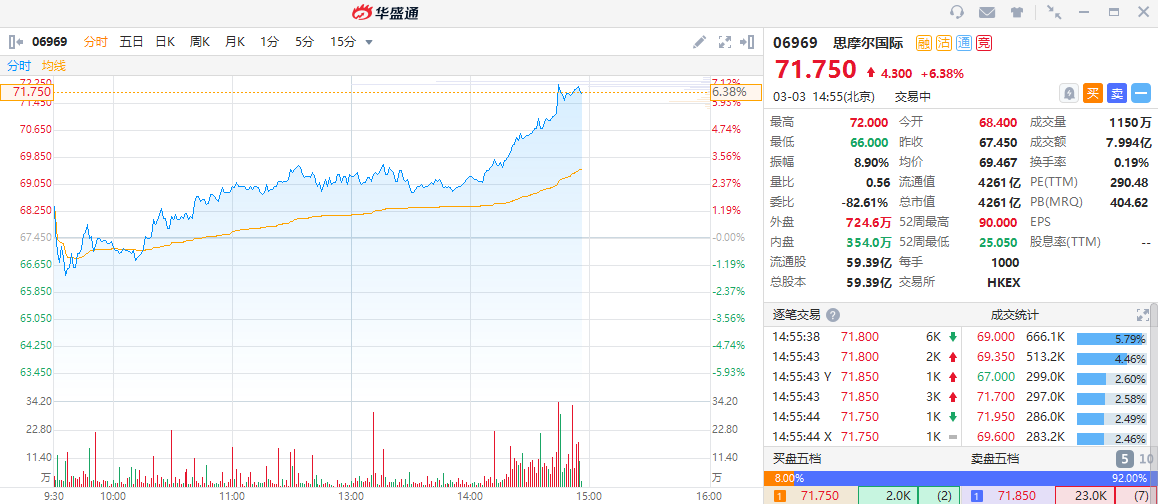 华盛资讯3月3日消息,思摩尔午后持续拉升超6%,成交额达8亿港元。截至发稿,思摩尔国际上涨6.38%,现报71.75港元每股,当前总市值为4261亿港元。