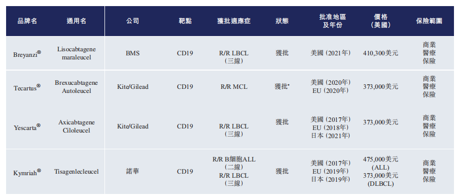 目前,并无CAR-T细胞疗法获国家药监局批准在中国上市。在美国,已有四种CAR-T产品获美国FDA批准上市:Kymriah、Yescarta、Tecartus及Breyanzi,均以CD19为靶点。自2017年上市以来,Kymriah和Yescarta的销量于2018年至2020年分别以84.1%和28.7%的复合年增长率快速增长。于2020年,Kymriah及Yescarta的全球销售分别达474百万美元及563百万美元。 Tecartus及Breyanzi分别于2020年及2021年获批上市。
