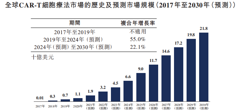 自2017年首批两个CAR-T产品获批以来,全球CAR-T市场一直在迅速扩大。由于CAR-T细胞疗法在治疗血液恶性肿瘤方面减少医疗需求缺口的潜力以及该等治疗的可负担性提高,全球CAR-T市场已从2017年的0.1亿美元增长到2019年的7亿美元,预计其增长将加速达至2024年的66亿美元,2019年至2024年的复合年增长率为55.0%。截至2030年,全球CAR-T市场预计达至218亿美元,2024年至2030年的复合年增长率为22.1%。