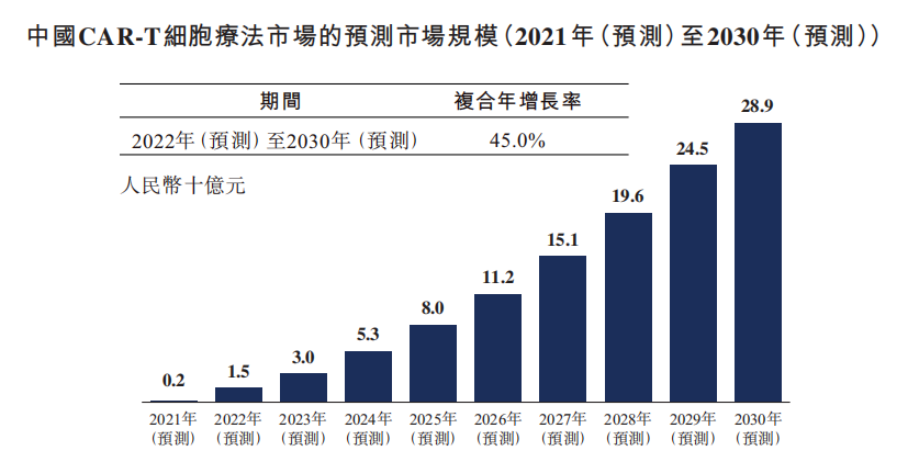 预计首批CAR-T细胞疗法将于2021年获得国家药监局批准并在中国推出,估计该年中国CAR-T疗法的市场规模为人民币2亿元。预计中国CAR-T细胞疗法市场规模将增长至2024年的人民币53亿元,并进一步增长至2030年的人民币289亿元,2022年至2030年的复合年增长率为45.0%。