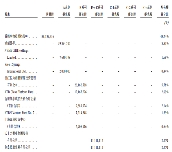 科济药业创始人兼董事长、CEO及科济生物医药(原名)董事长兼CEO李宗海持有益杰生物60%股权%,非执行董事郭炳森持有益杰生物10.2%股权,王华茂、郭华清均持有益杰生物10%股权。天士力医药持股2.45%,创富控股集团持股2.45%,深圳光量启新投资管理企业(有限合伙)持股为2.27%,合肥凯泰成长投资合伙企业(有限合伙)持股2.14%,中建投资本通过上海嘉稹投资中心(有限合伙)持股0.64%,阳光保险持股1.77%。