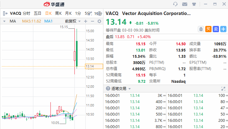 在消息公布后,VACQ股价表现较为强势,昨日小幅回调,站稳13美元大关。