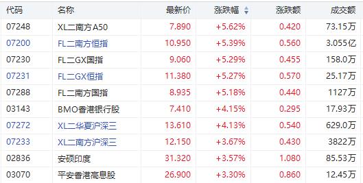 受消息影响,今日港股涨幅居前的ETF主要是做多类和银行股ETF相关,其中,南方两倍看多恒指涨5.39%,成交额3.01亿港元;BMO香港银行股ETF涨4.15%;南方两倍看多国指涨5.18%。