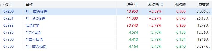 看多恒指相关ETF走强,南方两倍看多恒指(07200.HK)涨5.39%,成交额3.01亿港元。