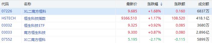 今日恒生科技指数涨1.17%。其中,南方两倍做多恒科(07226.HK)涨1.68 %,成交额6837万港元;做空两倍南方恒科跌2.17%,成交额5899万港元。
