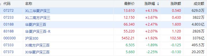 沪深300指数涨1.92%。其中,华夏做多沪深三百ETF涨4.13%;华夏做空沪深三百跌2.25%。