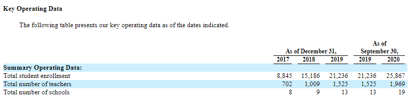 此外,第一高中教育集团一直同“衡水”密切合作,衡水中学在中国因其过硬的教学质量名声响亮。在第一高中教育集团所拥有的19所高中中,有16所与衡水中学有关。逐渐积累的品牌效应也吸引了更多的学生和人才加入。 据招股书,从2017年底至2019年底,第一高中教育集团的学生总从8845增加至21236,增长接近1.5倍,截至2020年9月30日,第一高中教育集团的学生总人数已经达到了25867人。与此同时,教师人数从2017年底702名,增加至1969名(截至2020年9月30日),实现了1.8倍增长。