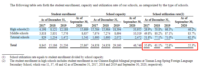 从上文数据来看,从2017年发展至今,第一高中教育集团学生总人数增长迅速,与此同时,集团正在不断扩大学校规模,其容纳量截至2020年9月30日,已达到46746人,较2017年底的容纳量增长接近1倍。因此,在2020年学校利用率出现了下滑,从2019年底的72.8%降至55.3%。从具体数据来看,利用率低的学校集中在2019年之后开办的新校区,其中利用率最低的一所为云南衡水丘北实验高中,学校使用率仅为5%,在接下来的发展中,无疑会对学校宣传招生能力有一定的考验。
