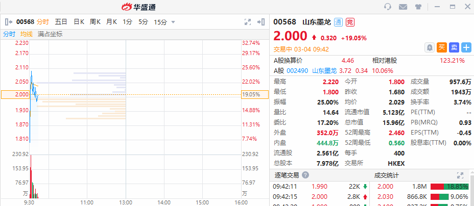 华盛资讯3月4日消息,山东墨龙早盘股价一度涨超25%。截至发稿,山东墨龙涨19.05%,现报2港元每股,暂成交1943万,当前总市值为15.96亿港元。自今年初以来,公司股价累计上涨超140%。