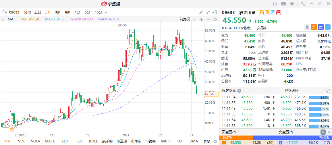 华盛资讯3月4日消息,农夫山泉近期股价持续下挫,连续9个交易日为下跌行情,累计跌幅达30%。截至发稿,农夫山泉跌6.76%,现报45.55港元每股,暂成交3.991亿港元,当前总市值为5124亿。