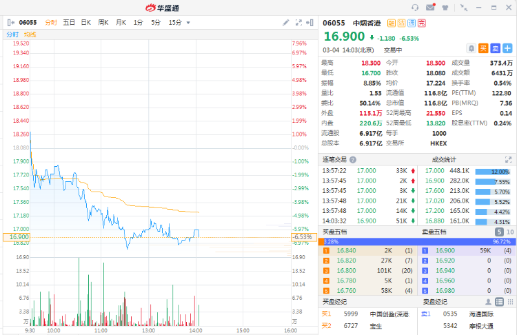 中烟香港(06055)近日公布2020年业绩,实现收入约34.81亿港元,同比减少61.2%净利约9519.2万港元,同比减少70.2%。截至发稿,中烟香港跌6.53%,报16.9港元,成交额6431万港元。