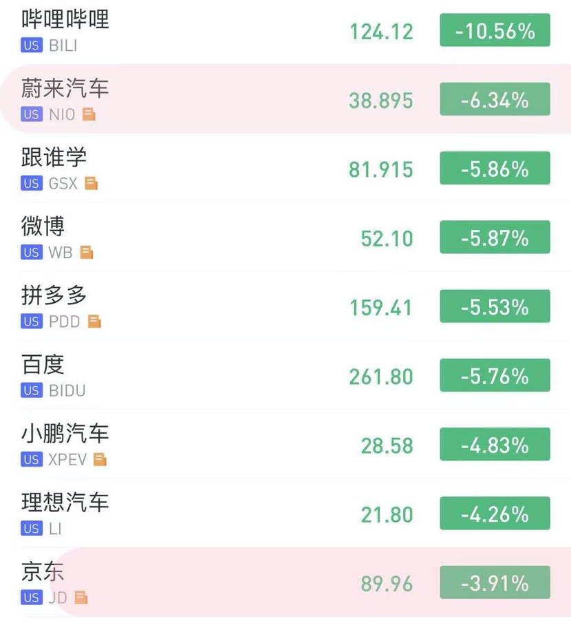 截至发稿,哔哩哔哩跌超10%,蔚来跌超6%,跟谁学、微博、拼多多、百度跌近6%,京东跌近4%。