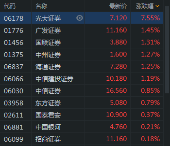 中资券商股直线拉升 光大证券涨近8%广发证券涨1.45%