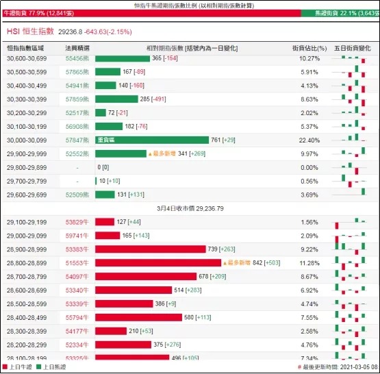 恒指牛证周四录得约1.32亿港元资金净入部署,近5日累计约1.65亿港元资金净流入;恒指熊证当日录得约1.57亿港元资金净流出,近5日累计约3.11亿港元资金净流出套现。