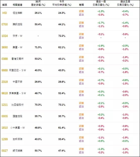 周四恒指相关权证的平均引伸波幅约24.3%,按日有所调升。个股方面,腾讯、美团、平安、比迪及银河相关认购证的引申波幅按日调升明显;相反,友邦相关认购证的引申波幅按日调降明显。