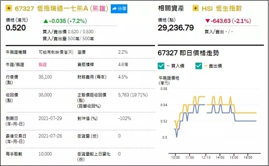 1、强势轮证:恒指瑞通一七熊(67327.HK),周四上涨7.2%;