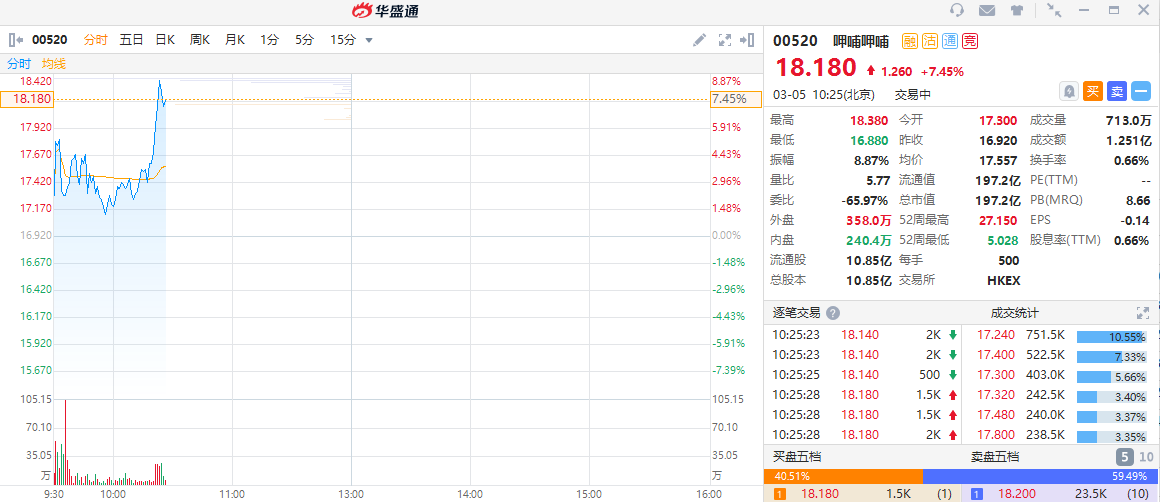 华盛资讯3月5日消息,呷哺呷哺今日低位回升,盘中直线快速拉升超7%。截至发稿,呷哺呷哺涨7.45%,现报18.18港元每股,暂成交1.251亿,现报197.2亿港元。