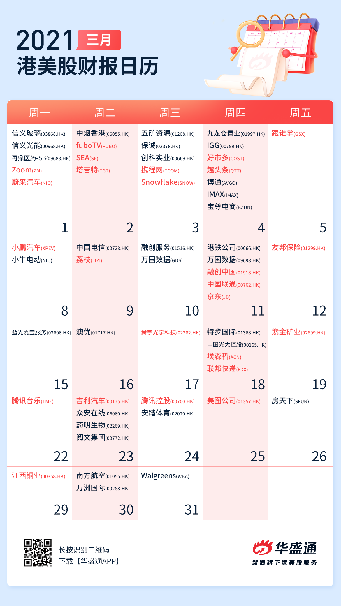 港美股财报季进入高峰期!3月份,携程、小鹏、京东、友邦保险、舜宇光学和腾讯控股等重磅个股排队交业绩,看点十足。