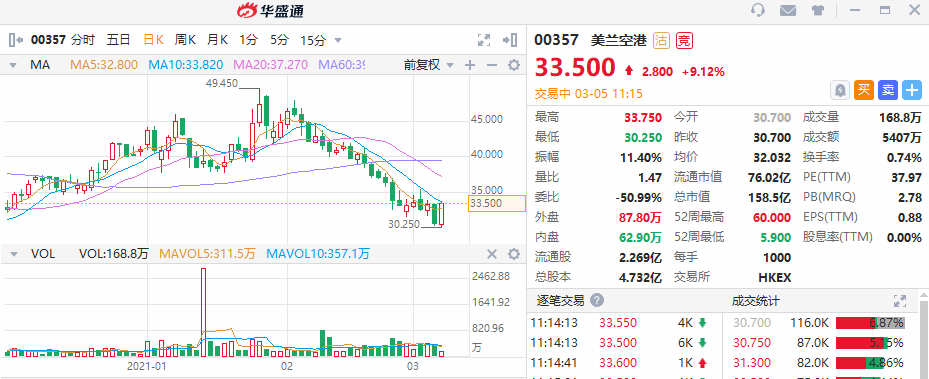 华盛资讯3月5日消息,美兰空港早盘股价急速反弹。截至发稿,美兰空港涨9.12%,现报33.5港元,成交额达5407万,当前总市值为158.5亿港元。