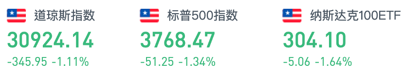 截至周四收市,道指跌345.95点,或1.11%,报30924.14点;纳指跌274.28点,或2.11%,报12723.47点;标普500指数跌51.25点,或1.34%,报3768.47点。