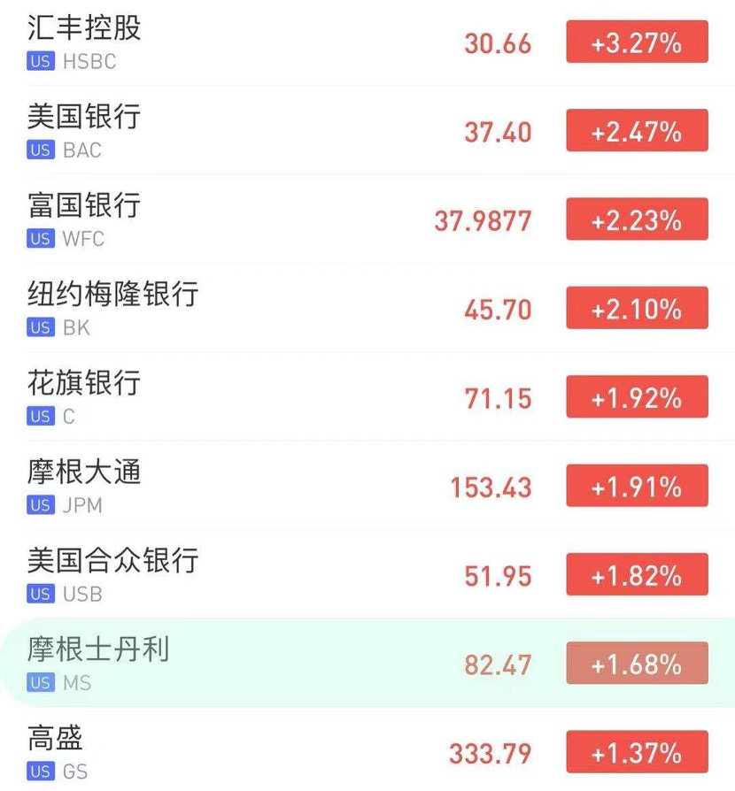 截至发稿,汇丰控股涨3.27%,美国银行、富国银行、纽约梅隆涨超2%,花旗、小摩涨近2%。