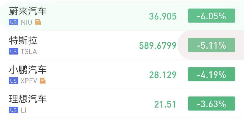 截至发稿,蔚来汽车大跌超6%,特斯拉跌超5%,小鹏汽车跌超4%,理想汽车跌3.63%。