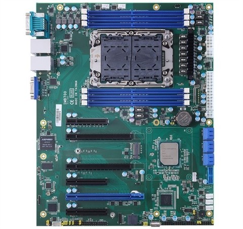 该主板两侧六条DDR4-3200 RDIMM/LRDIMM内存插槽,最大容量384GB,另有三条PCIe x16(顶部两条黑色支持PCIe 4.0)、三条PCIe 3.0 x8。