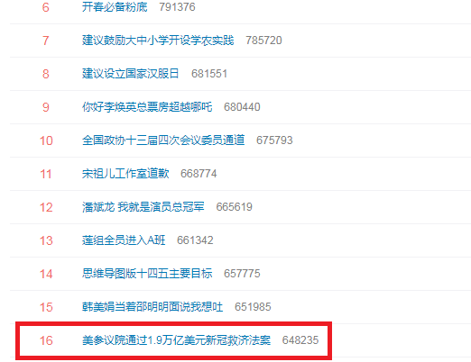 3月7日,“美参议院通过1.9万亿美元新冠救济法案”的微博话题冲上微博热搜。