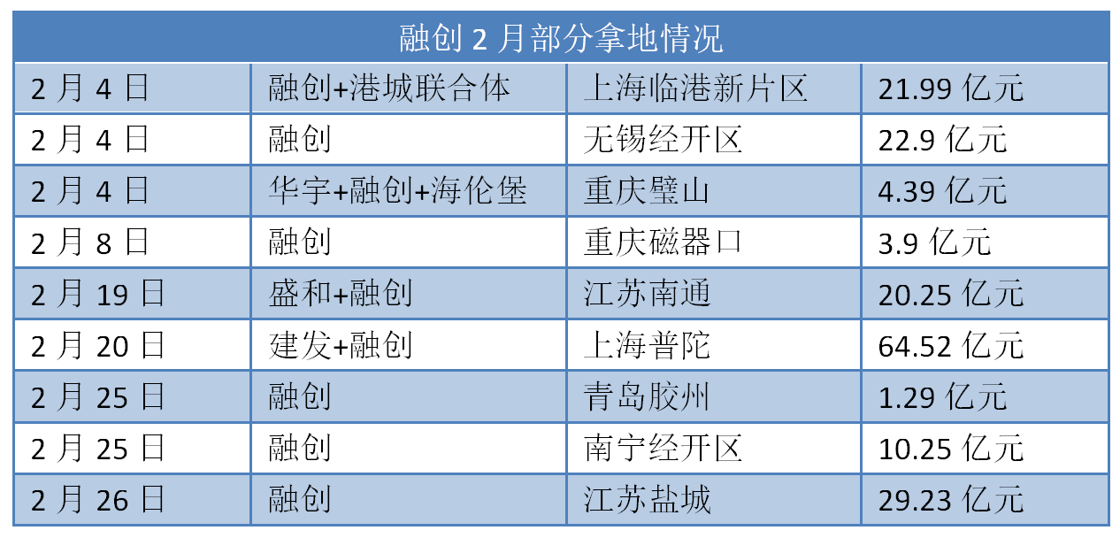 而在公开市场上,融创亦展现了积极的拿地积极性。据不完全统计,融创2月于上海、无锡、重庆、青岛等地接连拿地,土地成交金额达到180亿元。