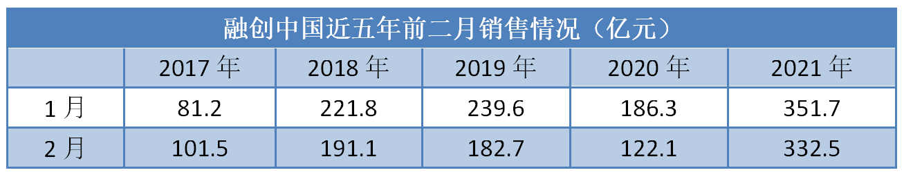 于2021年2月单月,融创中国实现合同销售金额约332.5亿元,同比增长172%,合同销售面积约218.4万平方米,合同销售均价约15220元/平方米。