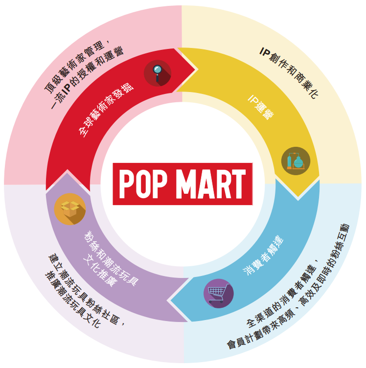 IP是泡泡玛特业务的核心。泡泡玛特建立了包括艺术家发掘、IP运营、消费者触达及潮玩文化推广在内的潮流玩具全产业链一体化平台。泡泡玛特运营的IP由独立艺术家、IP提供商及其内部设计团队创造。