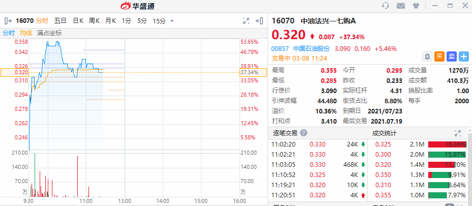 华盛资讯3月8日消息,港股石油股逆市上升。截至发稿,中国石油股份涨超5%,总市值破5600亿港元。其衍生品好仓同步跟涨,中油法兴一七购A现暴涨37.34%,其行使价为3.09港元,2021年7月23日到期,引伸波幅为44.48。