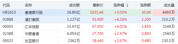 香港本地银行股逆势走高,渣打集团、汇丰控股涨超4%,中银香港、东亚银行升超2%。