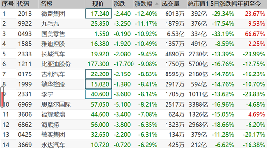 港股消费股遭洗仓,微盟集团跌超12%,九毛九、国美零售、雅迪控股跌超10%,长城汽车、比亚迪、吉利汽车跌9%,李宁、思摩尔等跌超8%,农夫山泉、华宝国际跌超7%,海底捞跌超6%,安踏跌超5%。