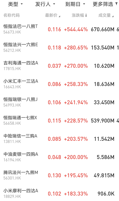 恒指法巴一八熊T(54673)涨544.44%占据涨幅榜第一。其次是恒指法兴一六熊E(56212)涨280.65%、吉利海通一四沽A(17815)涨270%。