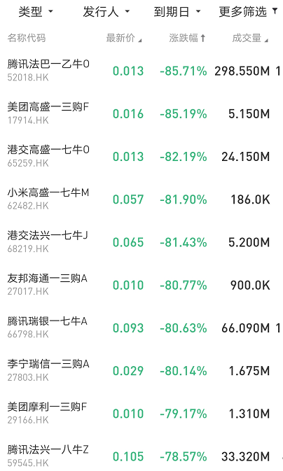 今日所有窝轮牛熊证合计成交297.96亿港元,占大市成交10.77%。