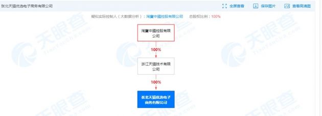 股权穿透图显示,该公司由浙江天猫技术有限公司100%持股,疑似实际控制人为淘宝中国控股有限公司。