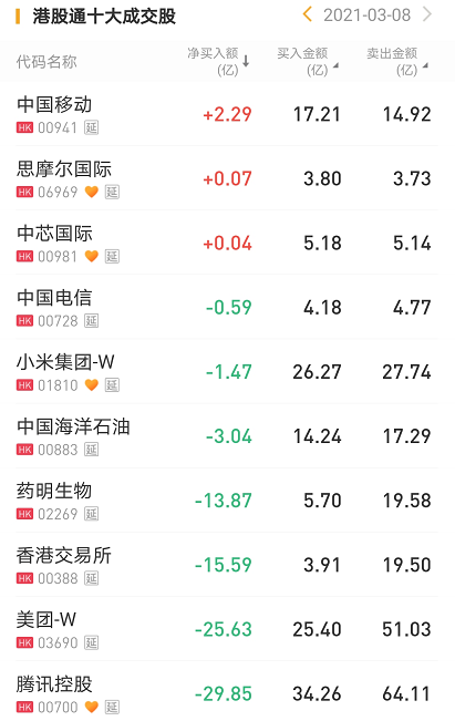 个股方面,今日南下资金净买入中国移动2.29亿港元,为今日买入之最。此外,南下资金净买入思摩尔国际0.07亿港元。