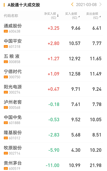 北上资金今日净买入通威股份3.25亿元,为今日买入之最。此外,北上资金今日净买入中国平安2.8亿元。
