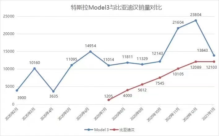 值得注意的是,在1月的新能源车销量榜单中,曾经独领风骚的特斯拉Model 3告别了“一枝独秀”,不少国产纯电动车型开始崭露头角,甚至实现了逆袭。