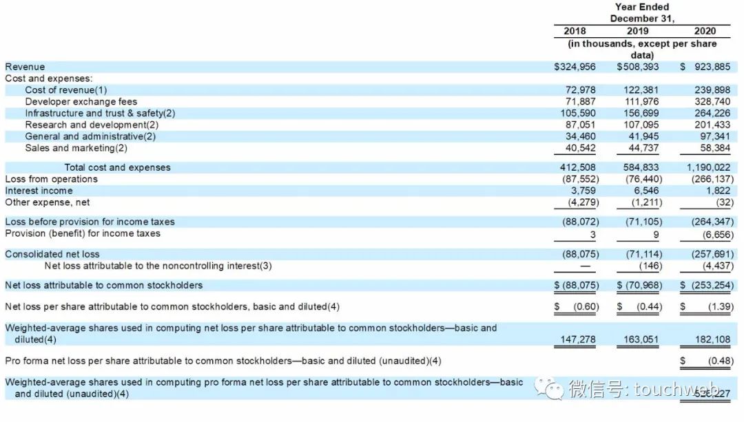 Roblox在2018年、2019年、2020年营收分别为3.25亿美元、5.08亿美元、9.24亿美元;运营亏损分别为8755万美元、7644万美元、2.66亿美元。