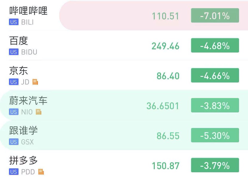 截至发稿,哔哩哔哩大跌7.01%,跟谁学跌超5%,百度、京东跌近5%,蔚来、拼多多跌近4%。