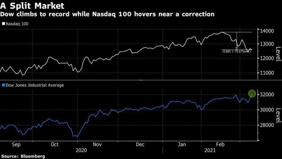 这也是1993年以来首次出现道指创纪录高位、而纳斯达克100指数从高位下跌近10%的情况。
